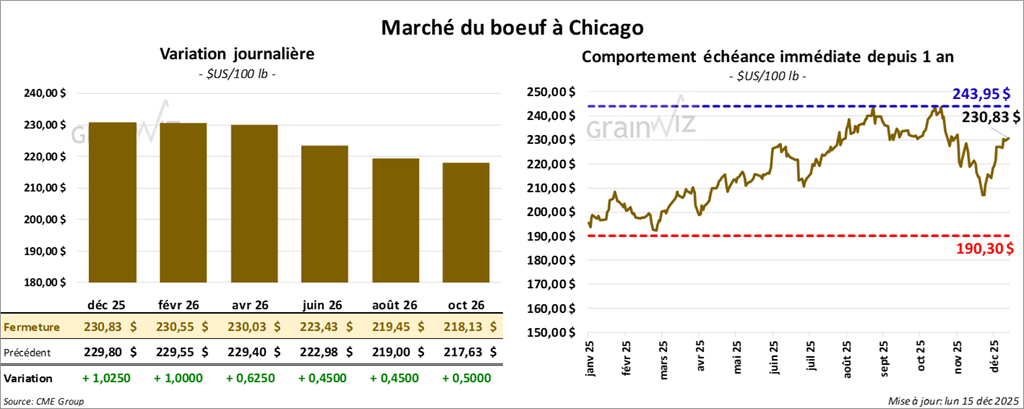 Le contrat de bœuf américain décembre 25 a clôturé à 230,83 $ (+ 1,03 $). Celui février 26 a fermé à 230,55 $ (+ 1,00 $). Celui avril 26 a terminé à 230,03 $ (+ 63 cents).