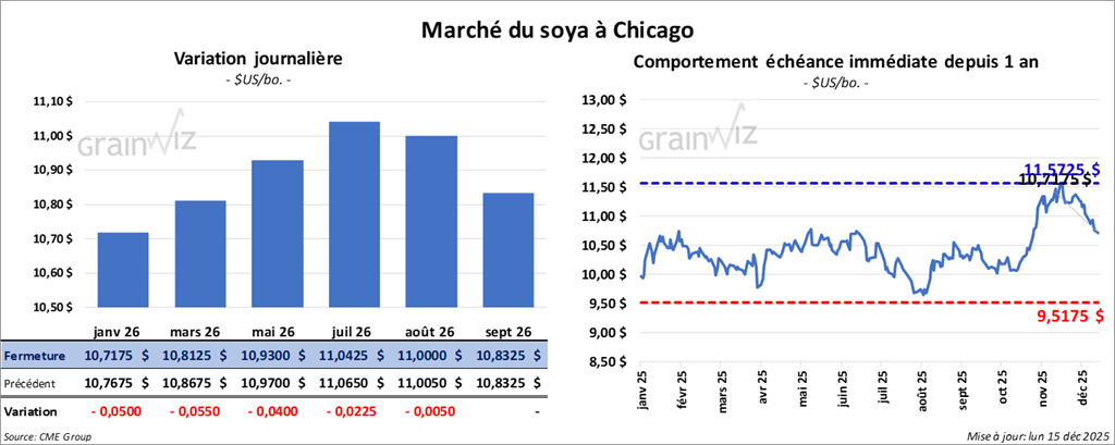 Le contrat de soya américain janvier 26 a clôturé à 10,7175 $ (- 5 cents). Celui mars 26 a fermé à 10,8125 $ (- 5 ½ cents). Celui mai 26 a terminé à 10,9300 $ (- 4 cents).