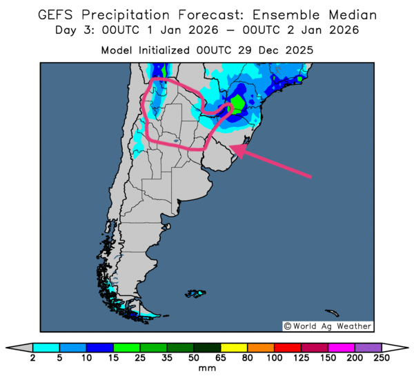 - Essentiellement, les prévisions météo pour l’Argentine se compliquent à court terme. L’analyse des cartes GFS de l’Argentine, fournies par World Ag Weather et dessinées jusqu'au 3e jour, indique un risque de temps sec persistant au centre et au sud du pays. Mais, comme le montre la carte du 3e jour ci-contre, un assèchement est aussi possible au nord, pourtant arrosé ces derniers jours. Bref, la situation argentine est à surveiller de près à court terme.