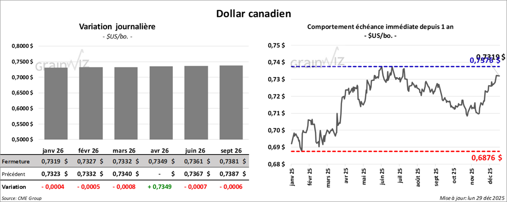 Du côté de l'huile de soya américaine, le contrat janvier 26 a terminé à 48,78 $ (+6 points). Celui mars 26 a fini à 49,29 $ (+7 points).