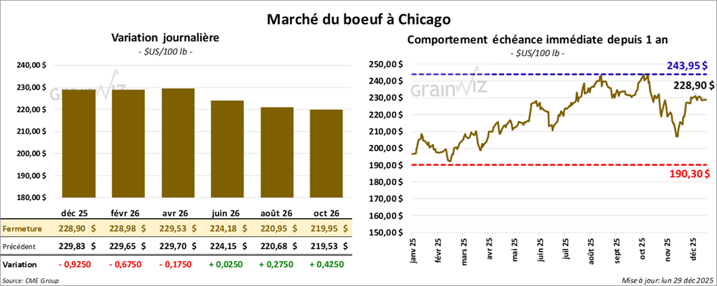 Le contrat de bœuf américain décembre 25 a clôturé à 228,90 $ (-93 cents). Celui février 26 a fermé à 228,98 $ (-68 cents). Celui avril 26 a terminé à 229,53 $ (-18 cents).