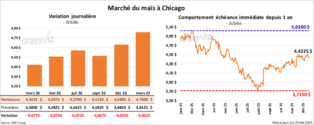 Le contrat de maïs américain mars 26 a clôturé à 4,4250 $ (-7 ½ cents). Celui mai 26 a fermé à 4,5075 $ (-7 ½ cents). Celui juillet 26 a terminé à 4,5725 $ (-7 cents).