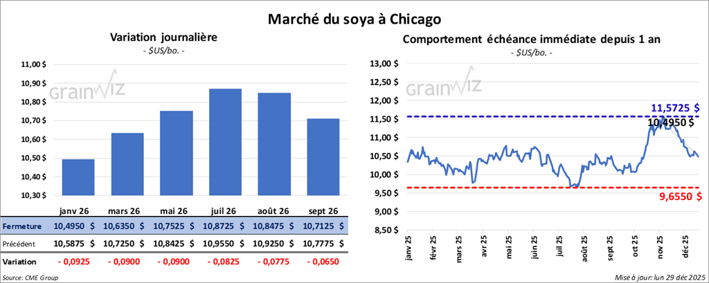 Le contrat de soya américain janvier 26 a clôturé à 10,4950 $ (-9 ¼ cents). Celui mars 26 a fermé à 10,6375 $ (-8 ¾ cents). Celui mai 26 a terminé à 10,7525 $ (-9 cents).