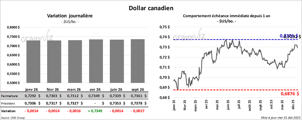 Du côté de l'huile de soya américaine, le contrat janvier 26 a terminé à 48,07 $ (-86 points). Celui mars 26 a fini à 48,56 $ (-88 points).