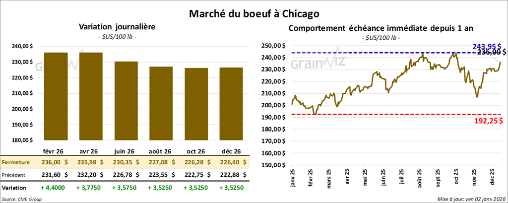 Le contrat de bœuf américain février 26 a clôturé à 236,00 $ (+4,40$). Celui avril 26 a fermé à 235,98 $ (+3,78$). Celui juin 26 a terminé à 230,35 $ (+3,58$).