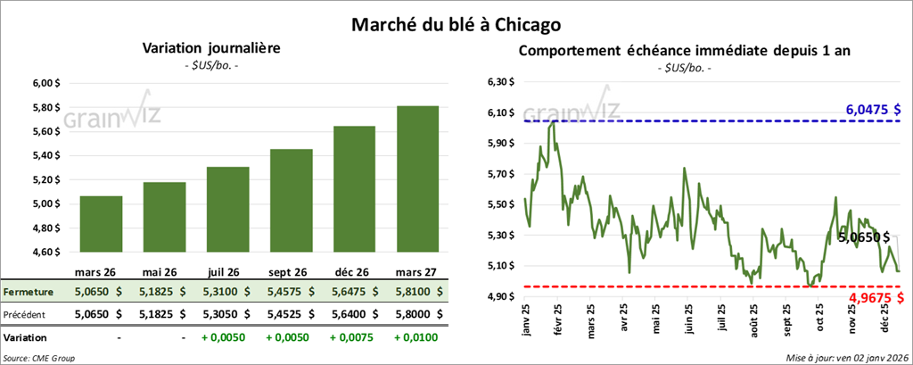 À Chicago, le contrat de blé mars 26 a clôturé à 5,0650 $ (0,0). Celui mai 26 a fermé à 5,1825 $ (0,0). Celui juillet 26 a terminé à 5,3100 $ (+½ cent).