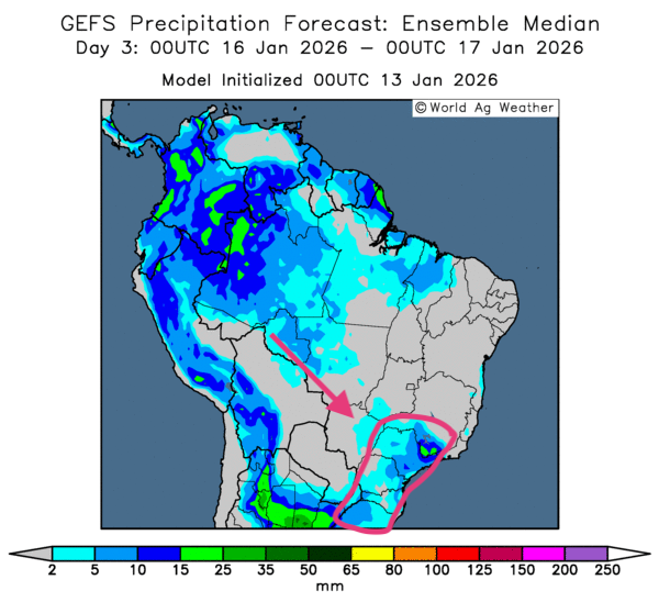 - Dans l’ensemble, les prévisions météo à court terme demeurent favorables pour le Brésil. L’analyse des cartes GFS (World Ag Weather), illustrées jusqu’au 3e jour, laisse entrevoir un assèchement possible dans plusieurs régions du centre du pays, notamment au Mato Grosso et dans les secteurs environnants. Cependant, des zones plus à l’est — de l’État de São Paulo vers le sud jusqu’au Rio Grande do Sul — pourraient tout de même recevoir des précipitations généralement bénéfiques. Voir la carte du 3e jour ci-contre.