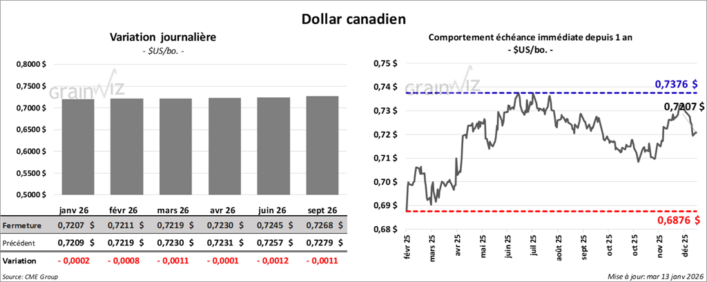 À Chicago, le contrat mars 2026 a clôturé à 5,1050 $ (-¾ cent). Celui mai 2026 a fermé à 5,2175 $ (-1 cent). Celui juillet 2026 a terminé à 5,3450 $ (-1 ¼ cent).