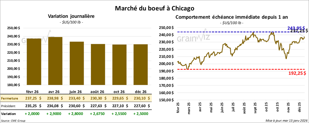 Le contrat de bœuf américain février 2026 a clôturé à 237,25 $ (+2,00 $). Celui d’avril 2026 a fermé à 238,98 $ (+2,90 $). Celui juin 2026 a terminé à 233,40 $ (+2,80 $).