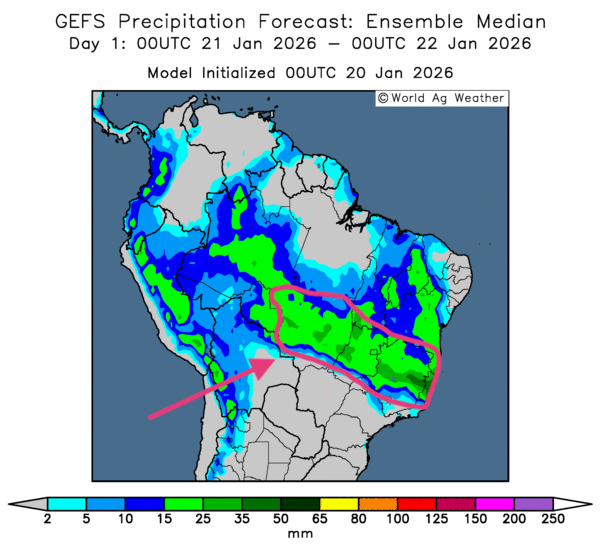 - Globalement, les prévisions météorologiques pour le Brésil restent favorables à court terme. L'analyse des cartes GFS (World Ag Weather) pour le Brésil, illustrées jusqu'au 3e jour, révèle des possibilités de pluie pour le centre et l'est, notamment entre le Mato Grosso (centre-sud) et le Minas Gerais (est). Les cartes indiquent aussi des probabilités de temps sec pour le sud, entre le Mato Grosso do Sul et le São Paulo, en passant par le Rio Grande do Sul. Comme le montre la carte prévue pour demain ci-contre, des précipitations abondantes pourraient survenir entre le Mato Grosso et le Minas Gerais.