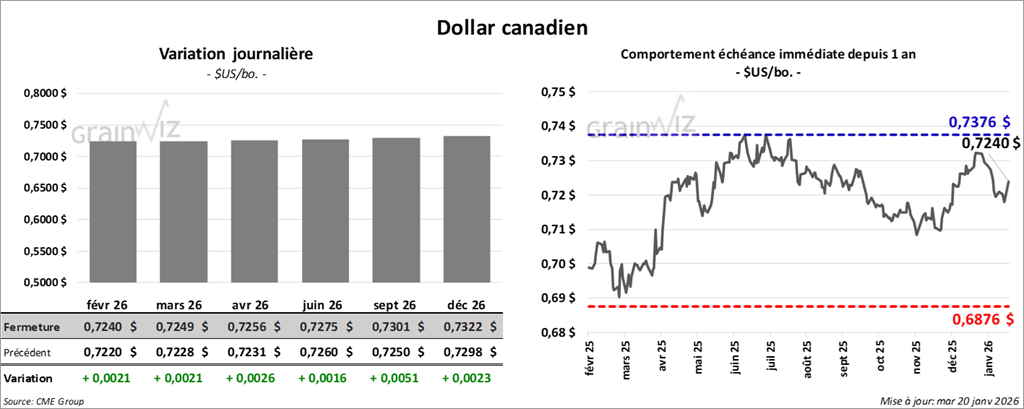 Du côté de l’huile de soya américaine, le contrat de mars 2026 a terminé à 52,52 $ (-9 points). Celui de mai 2026 a fini à 53,05 $ (-10 points).