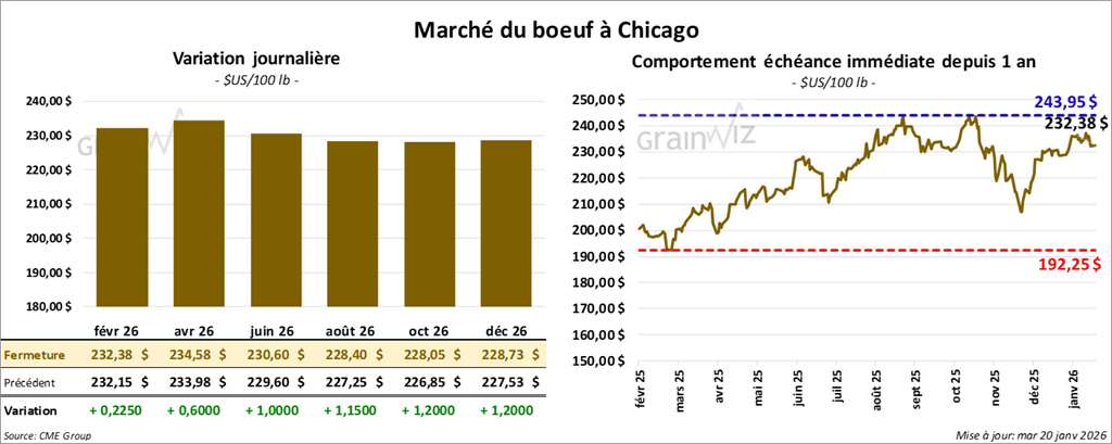 Le contrat de bœuf américain pour février 2026 a clôturé à 232,38 $ (+23 cents). Celui d’avril 2026 a fermé à 234,58 $ (+60 cents). Celui de juin 2026 a terminé à 230,60 $ (+1,00 $).