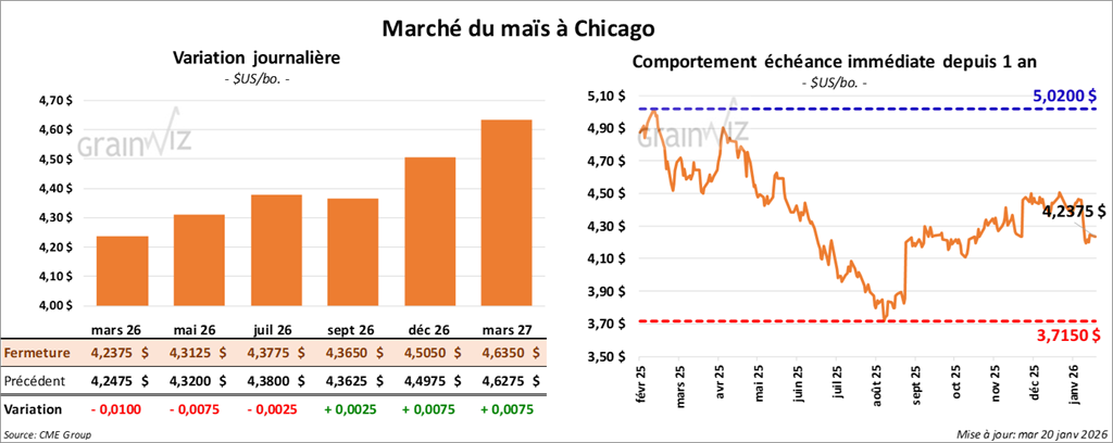 Le contrat de maïs américain pour mars 2026 a clôturé à 4,2375 $ (-1 cent). Celui de mai 2026 a fermé à 4,3150 $ (-½ cent). Celui de juillet 2026 a terminé à 4,3775 $ (-¼ cent).