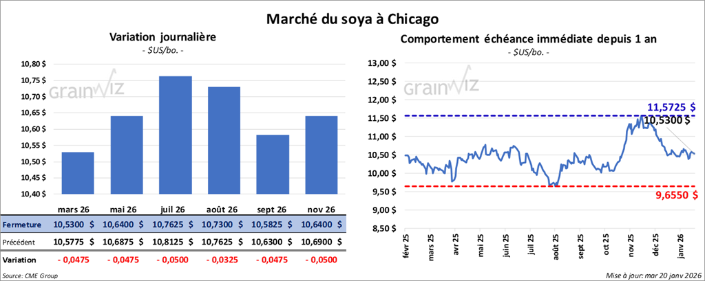 Le contrat de soya américain pour mars 2026 a clôturé à 10,5300 $ (-4 ¾ cents). Celui de mai 2026 a fermé à 10,6425 $ (-4 ½ cents). Celui de juillet 2026 a terminé à 10,7650 $ (-4 ¾ cents).