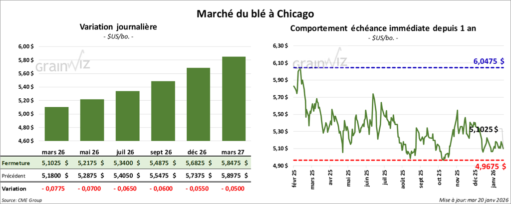 À Chicago, le contrat de blé pour mars 2026 a clôturé à 5,1025 $ (-7 ¾ cents). Celui de mai 2026 a fermé à 5,2200 $ (-6 ¾ cents). Celui de juillet 2026 a terminé à 5,3425 $ (-6 ¼ cents).