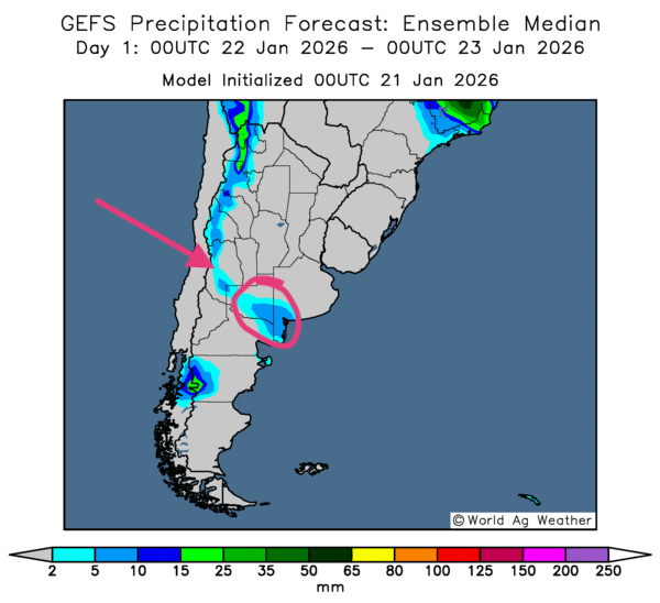 - World Weather prévoit pour les prochains jours des précipitations pour certaines parties du sud de l'Argentine. Si elles ont lieu, ces averses seront bénéfiques dans les secteurs asséchés depuis quelque temps déjà. Les météorologues sont d'avis que l'humidité des sols pourrait s'améliorer dans plusieurs régions. Pour l'instant, un stress hydrique est perceptible dans les régions arides du Sud.