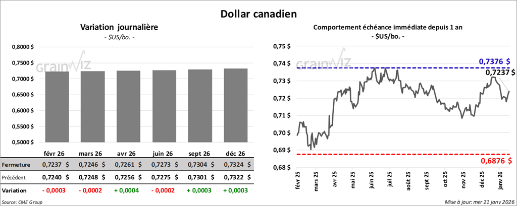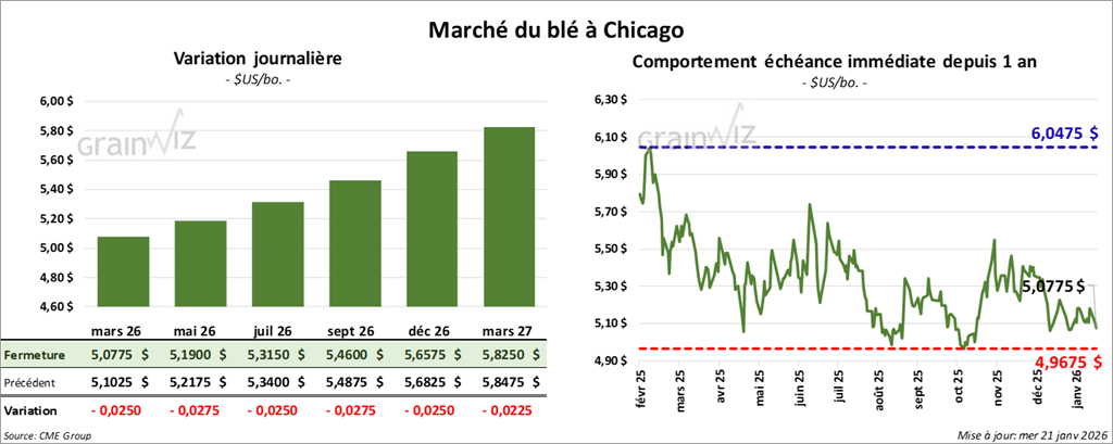 À Chicago, le contrat de blé mars 26 a clôturé à 5,0775 $ (-2 ½ cents). Celui mai 26 a fermé à 5,1900 $ (-2 ¾ cents). Celui juillet 26 a terminé à 5,3150 $ (-2 ½ cents).