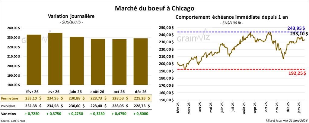 Le contrat de bœuf américain février 26 a clôturé à 233,10 $ (+73 cents). Celui avril 26 a fermé à 234,95 $ (+38 cents). Celui juin 26 a terminé à 230,88 $ (+28 cents).