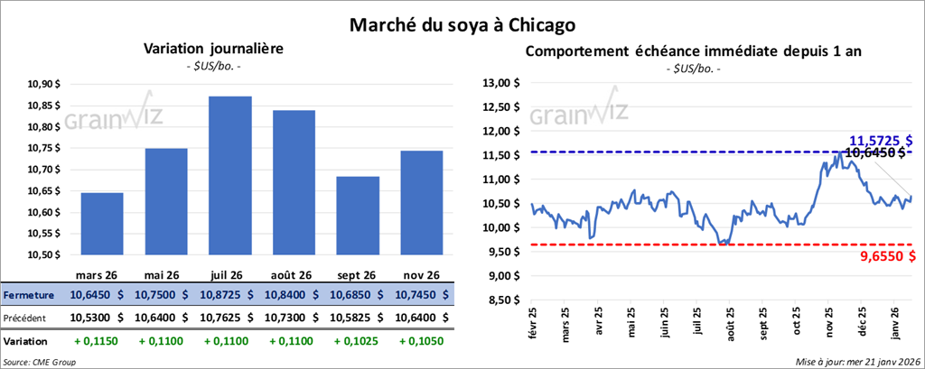 Le contrat de soya américain mars 26 a clôturé à 10,6450 $ (+11 ½ cents). Celui mai 26 a fermé à 10,7500 $ (+11 cents). Celui juillet 26 a terminé à 10,8725 $ (+11 cents).
