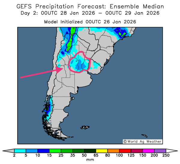 - En Argentine, les prévisions météorologiques demeurent plus complexes. L’analyse des cartes GFS (World Ag Weather) jusqu’au 3e jour indique des possibilités de pluie plus ou moins abondantes pour certaines parties du centre du pays. Des provinces telles qu’Entre Rios, Santa Fe et Córdoba pourraient recevoir des précipitations légères mais bénéfiques (voir la carte du 3e jour ci-contre).