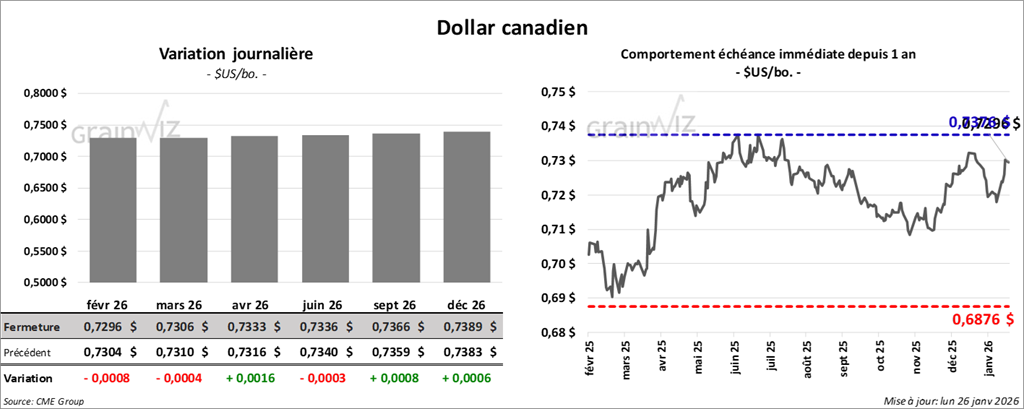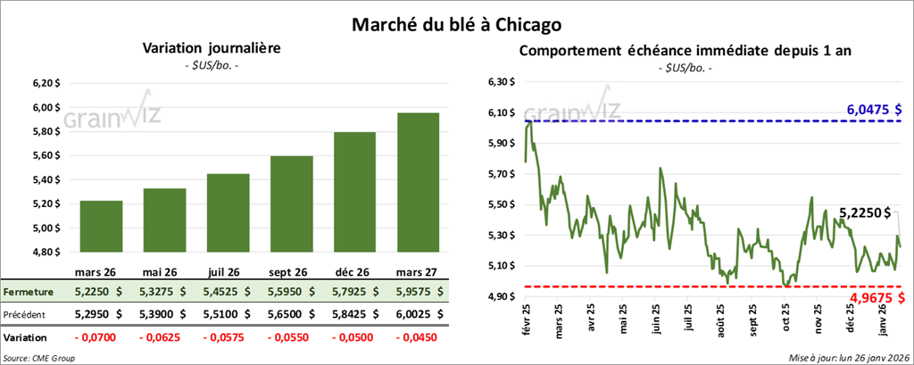 À Chicago, le contrat blé mars 26 a clôturé à 5,2250 $ (-7 cents). Celui mai 26 a fermé à 5,3275 $ (-6 ¼ cents). Celui juillet 26 a terminé à 5,4525 $ (-5 ¾ cents).