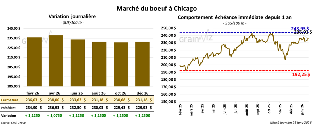 Le contrat bœuf américain février 26 a clôturé à 236,03 $ (+ 1,13 $). Celui avril 26 a fermé à 238,00 $ (+ 1,08 $). Celui juin 26 a terminé à 233,63 $ (+ 1,13 $).
