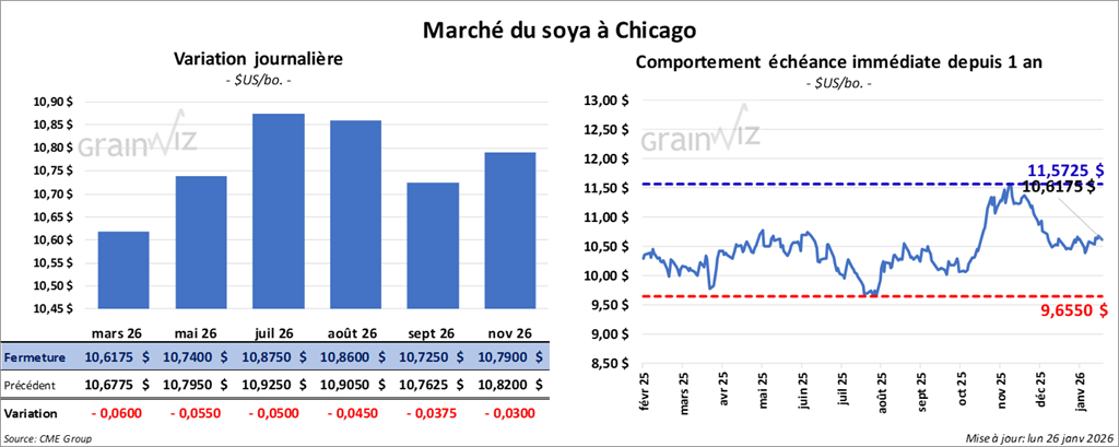 Le contrat soya américain mars 26 a clôturé à 10,6175 $ (-6 cents). Celui mai 26 a fermé à 10,7400 $ (-5 ½ cents). Celui juillet 26 a terminé à 10,8750 $ (-5 cents).