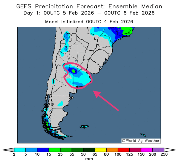 - Essentiellement, les prévisions météo pour l’Argentine restent à surveiller à court terme. L’analyse des cartes GFS (World Ag Weather), dessinées jusqu’au 3e jour, indique des possibilités de pluie pour certaines parties du nord-ouest et du centre-est. Comme l’illustre la carte de demain présentée ci-dessous, des averses plus ou moins légères pourraient survenir dans les provinces de Buenos Aires, La Pampa, San Luis et Córdoba. Il existe toutefois des possibilités de conditions sèches persistantes pour le nord-est et plusieurs parties du sud de l’Argentine.