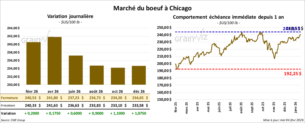 Le contrat de bœuf américain février 26 a clôturé à 240,53 $ (+ 20 cents). Celui avril 26 a fermé à 241,80 $ (+ 18 cents). Celui juin 26 a terminé à 237,23 $ (+ 60 cents).
