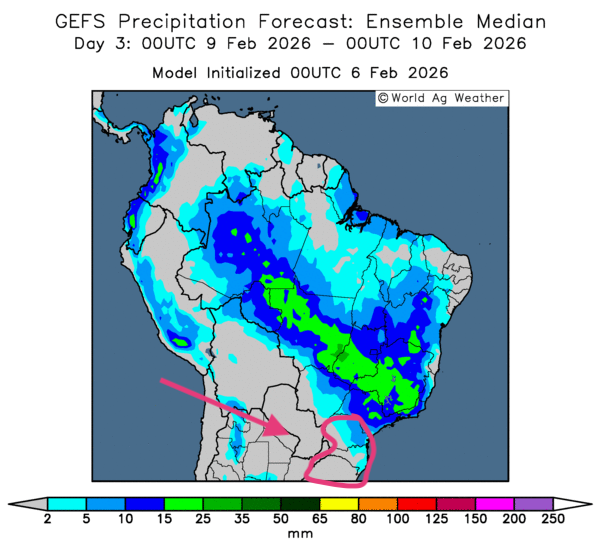 - À court terme, les prévisions météo pour le Brésil évoluent peu. L’analyse des cartes GFS (World Ag Weather), présentées jusqu’au 3e jour, montre toujours des possibilités de précipitations pour le centre, le nord et l’est. En revanche, si des averses sont possibles dans le sud du pays, elles pourraient rester plus limitées dans le sud-est, du Paraná jusqu’au Rio Grande do Sul (voir la carte du 3e jour ci-contre).