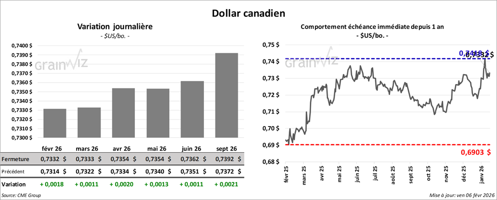 Du côté de l’huile de soya américaine, le contrat mars 26 a terminé à 55,33 $ (- 32 points). Celui mai 26 a fini à 55,84 $ (- 33 points).