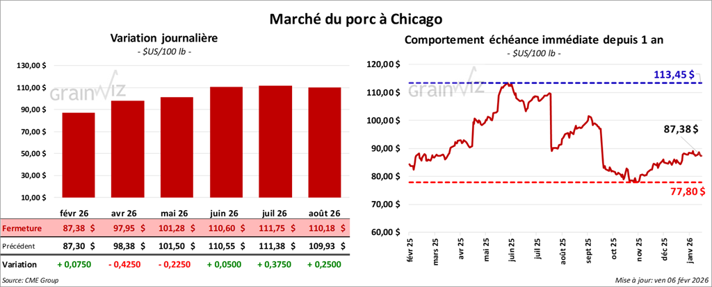 Le contrat de porc américain février 26 a clôturé à 87,38 $ (+ 0,08 $). Celui avril 26 a fermé à 97,95 $ (- 43 cents). Celui mai 26 a terminé à 101,28 $ (- 23 cents).