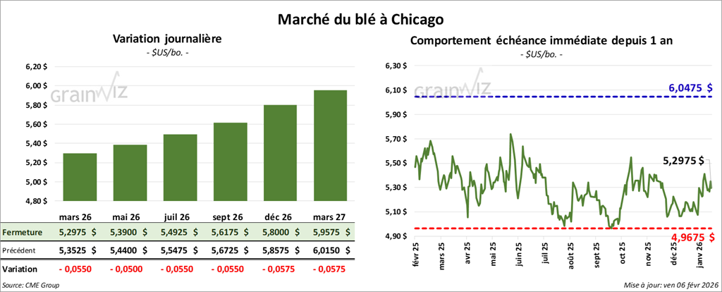 À Chicago, le contrat de blé mars 26 a clôturé à 5,3075 $ (- 4 ½ cents). Celui mai 26 a fermé à 5,3950 $ (- 4 ½ cents). Celui juillet 26 a terminé à 5,5000 $ (- 4 ¾ cents).