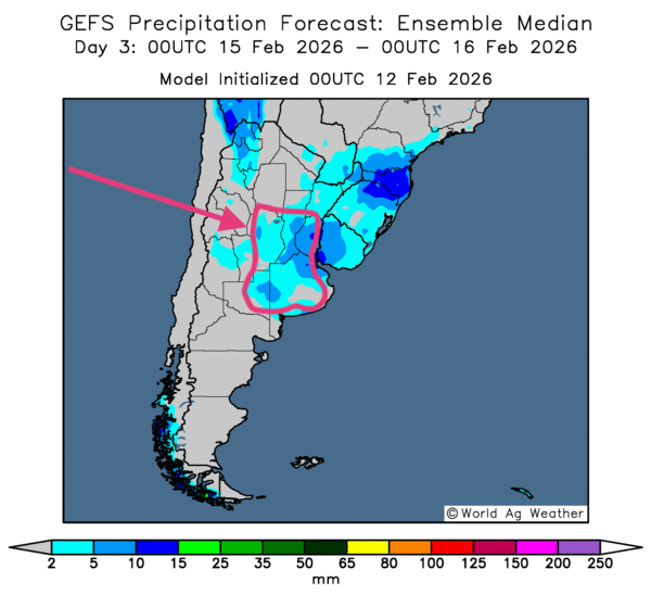 - Essentiellement, certains changements météorologiques favorables sont prévus à court terme pour l'Argentine. L'analyse des cartes GFS (World Ag Weather) dessinées jusqu'au 3e jour indique des possibilités de pluies concentrées dans le nord et certaines parties du centre du pays. Un changement s’opérerait peut-être dans les secteurs asséchés plus à l'est, dans les environs des provinces de Buenos Aires, Santa Fe, Entre Rios et Córdoba, qui pourraient recevoir des pluies légères, bénéfiques, mais sans doute insuffisantes pour réduire de façon significative le stress hydrique subi par les différentes cultures depuis quelque temps déjà (voir la carte du 3e jour ci-contre).