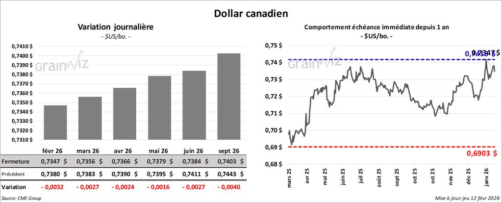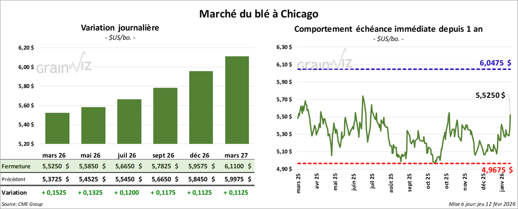 À Chicago, le contrat de blé mars 26 a clôturé à 5,5250 $ (+ 15 ¼ cents). Celui mai 26 a fermé à 5,5850 $ (+ 13 ¼ cents). Celui juillet 26 a terminé à 5,6650 $ (+ 12 cents).