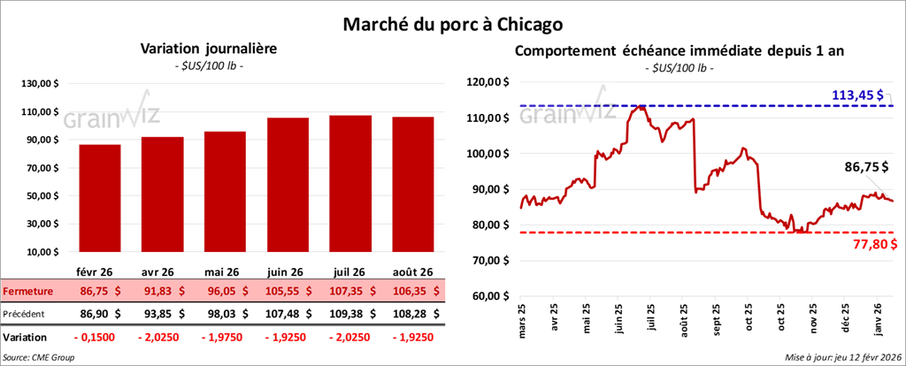 Le contrat de porc américain février 26 a clôturé à 86,75 $ (-15 cents). Celui avril 26 a fermé à 91,83 $ (-2,03 $). Celui mai 26 a terminé à 96,05 $ (-1,98 $).