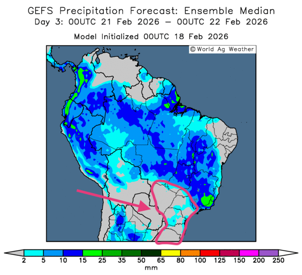- Globalement, les conditions météorologiques semblent s’améliorer légèrement à court terme dans plusieurs régions de l’Argentine. L’analyse des cartes GFS (World Ag Weather), dessinées jusqu’au 3e jour, indique des probabilités d’averses bénéfiques pour plusieurs régions du nord, du centre et du sud du pays. Toutefois, certains secteurs de l’extrême nord et de l’est de l’Argentine pourraient connaître un temps toujours aussi sec. Les provinces comme celles de Buenos Aires et de La Pampa pourraient être particulièrement touchées (voir la carte du 3e jour ci-contre).