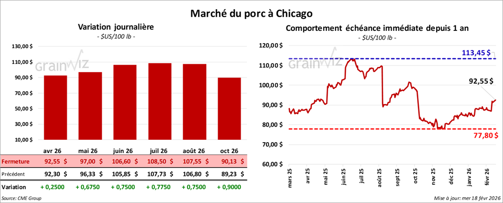 Le contrat de porc américain avril 26 a clôturé à 92,55 $ (+ 25 cents). Celui mai 26 a fermé à 97,00 $ (+ 68 cents). Celui juin 26 a terminé à 106,60 $ (+ 75 cents).