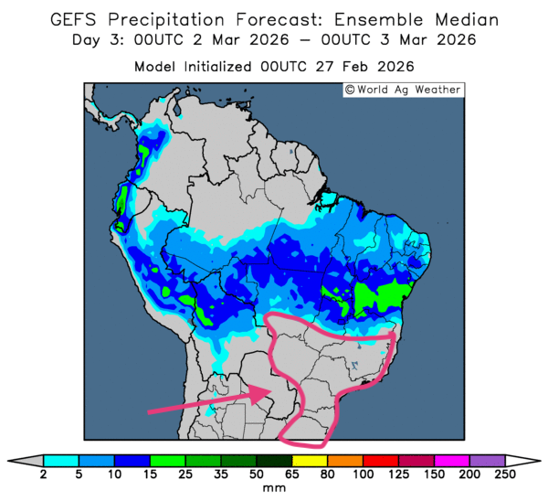 - Certains changements météorologiques s’opèrent à court terme pour le Brésil. L'analyse des cartes GFS (World Ag Weather) projetées jusqu'au 3e jour révèle que les pluies pourraient se diriger vers le nord du pays, si bien que certaines parties du centre-sud et de l’est pourraient s’assécher. Ces conditions sèches pourraient, dans certains cas, être bénéfiques. Toutefois, le temps sec persistant dans le sud et le sud-est, plus particulièrement dans la région du Rio Grande do Sul et même plus au nord, pourrait causer des problèmes de stress hydrique constant (voir notamment la carte du 3e jour ci-contre).