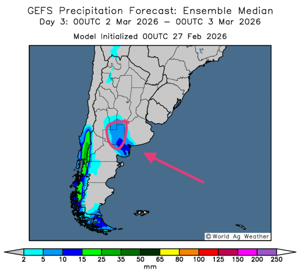 - Essentiellement, les prévisions météorologiques à court terme restent un problème récurrent pour l'Argentine. L'analyse des cartes GFS (World Ag Weather) projetées jusqu'au 3e jour montre toujours un temps sec persistant sur l’ensemble du territoire. Ces conditions rendent la croissance des cultures plus difficile et aggravent les problèmes de qualité, toujours plus présents dans de nombreux secteurs. Cependant, comme l'indique cette carte du 3e jour, des précipitations plus ou moins soutenues pourraient avoir lieu autour de la province de La Pampa, située dans le centre-sud de l'Argentine.