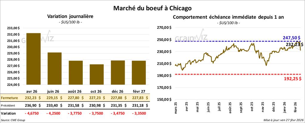 Le contrat de bœuf américain février 26 a clôturé à 244,00 $ (- 2,00 $). Celui avril 26 a fermé à 232,23 $ (- 4,68 $). Celui juin 26 a terminé à 229,15 $ (- 4,25 $).
