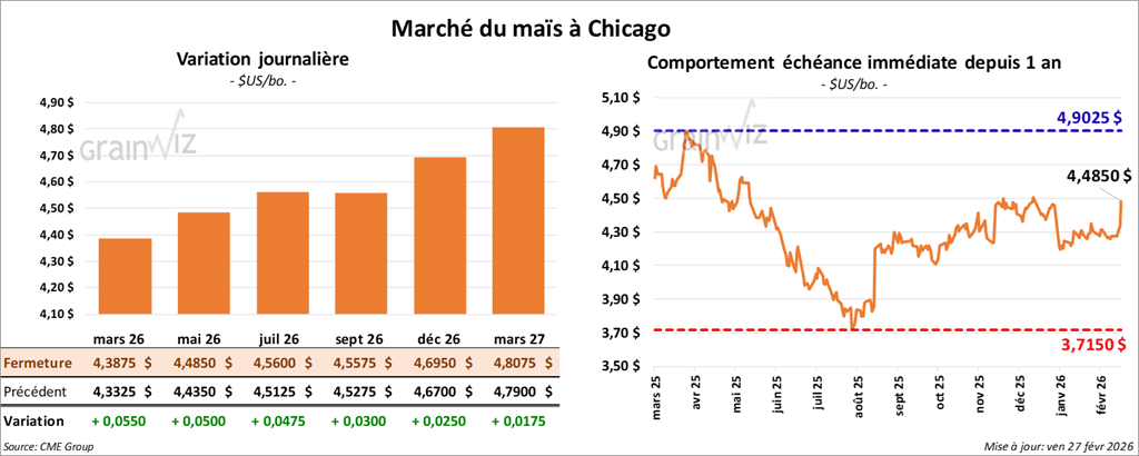 Le contrat de maïs mars 26 a clôturé à 4,3875 $ (+ 5 ½ cents). Celui mai 26 a fermé à 4,4850 $ (+ 5 cents). Celui juillet 26 a terminé à 4,5600 $ (+ 4 ¾ cents).