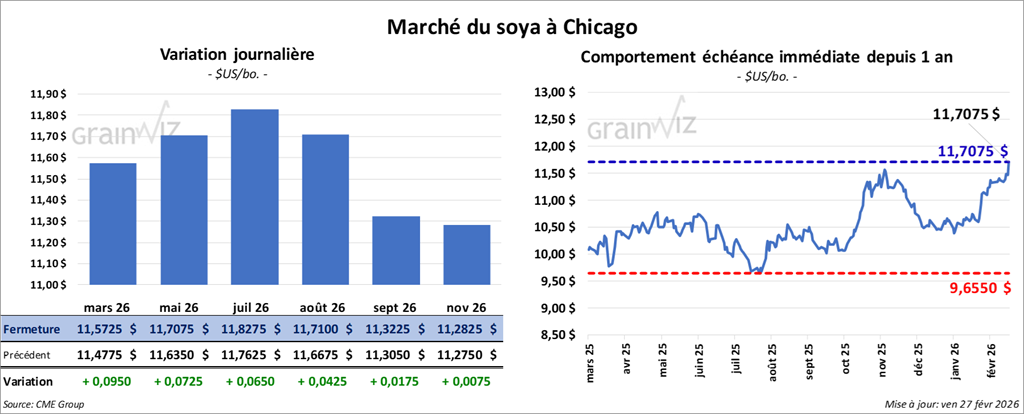 Le contrat de soya mars 26 a clôturé à 11,5725 $ (+ 9 ½ cents). Celui mai 26 a fermé à 11,7075 $ (+ 7 ¼ cents). Celui juillet 26 a terminé à 11,8275 $ (+ 6 ½ cents).