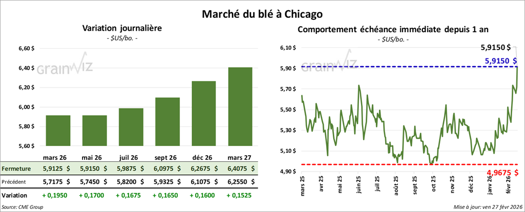 À Chicago, le contrat de blé mars 26 a clôturé à 5,9125 $ (+ 19 ½ cents). Celui mai 26 a fermé à 5,9150 $ (+ 17 cents). Celui juillet 26 a terminé à 5,9875 $ (+ 16 ¾ cents).