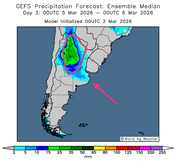 - Essentiellement, les prévisions météorologiques pour l'Argentine s'améliorent à court terme. L'analyse des cartes GFS (World Ag Weather), dessinées jusqu'au 3e jour, indique des possibilités de pluies bénéfiques pour les régions asséchées du nord et du centre (voir notamment la carte du 3e jour ci-contre). Toutefois, elle révèle également que certaines parties du centre et du sud de l'Argentine pourraient toujours présenter un manque de précipitations pourtant nécessaires. Cela signifie que plusieurs régions des provinces de La Pampa et de Buenos Aires, notamment, pourraient toujours être confrontées à un temps sec persistant et dévastateur.