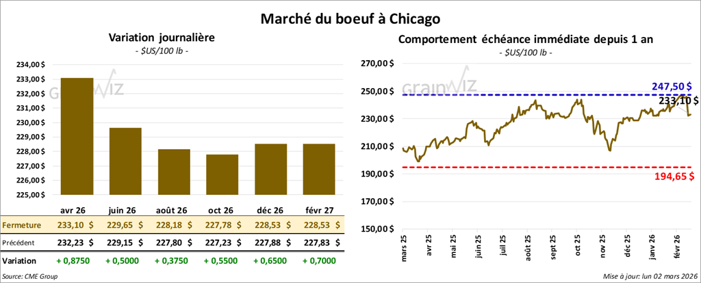 Le contrat de bœuf américain avril 26 a clôturé à 233,10 $ (+ 88 cents). Celui juin 26 a fermé à 229,65 $ (+ 50 cents). Celui août 26 a terminé à 228,18 $ (+ 38 cents).
