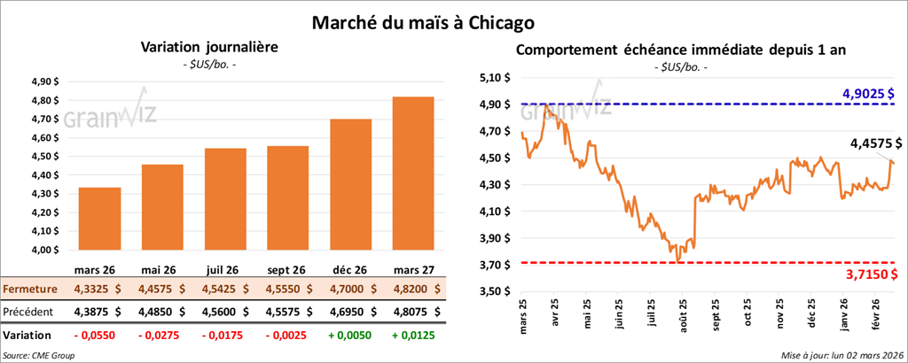 Le contrat de maïs américain mars 26 a clôturé à 4,3325 $ (- 5 ½ cents). Celui mai 26 a fermé à 4,4575 $ (- 2 ¾ cents). Celui juillet 26 a terminé à 4,5425 $ (- 1 ¾ cent).