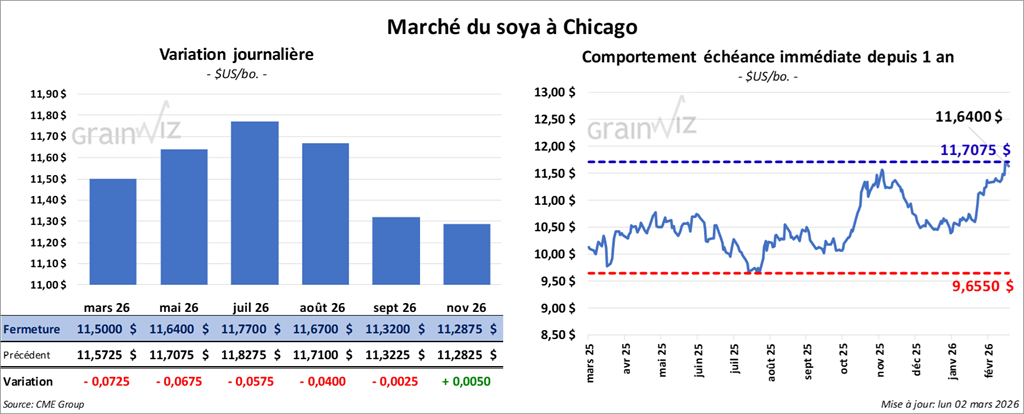 Le contrat de soya américain mars 26 a clôturé à 11,5000 $ (- 7 ¼ cents). Celui mai 26 a fermé à 11,6400 $ (- 6 ¾ cents). Celui juillet 26 a terminé à 11,7700 $ (- 5 ¾ cents).