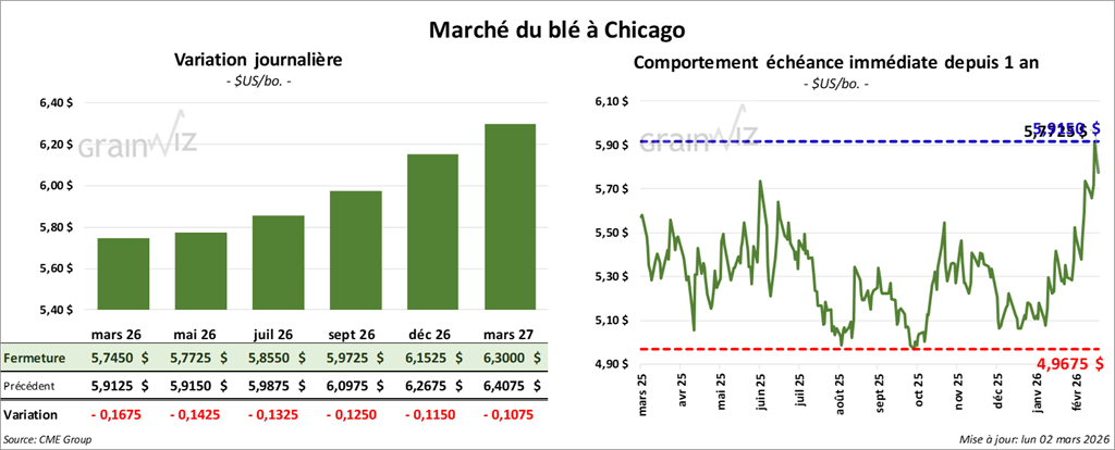 À Minneapolis, le contrat de blé de printemps mars 26 a terminé à 5,9750 $ (- 1 ¾ cent). Celui mai 26 a fini à 6,1000 $ (- 2 ¾ cents). Celui juillet 26 a clôturé à 6,2425 $ (- 3 cents).