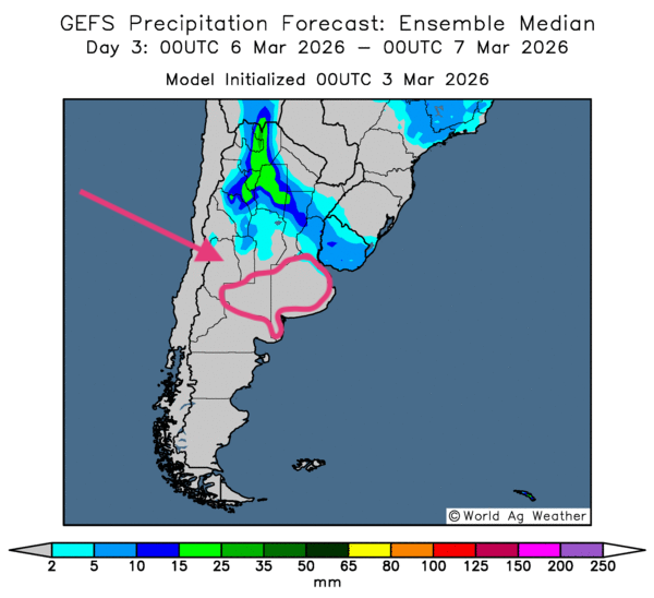 • Essentiellement, les prévisions météorologiques s’améliorent à court terme pour certaines parties de l’Argentine. L’analyse des cartes GFS (World Ag Weather) présentées jusqu’au 3e jour montre des possibilités de pluies bénéfiques pour le nord et certaines parties du centre du pays. Toutefois, un temps sec pourrait persister du centre jusqu’au sud de l’Argentine. Des provinces comme La Pampa et Buenos Aires, notamment, pourraient être affligées par des conditions sèches excessives, entraînant un stress hydrique constant pour différentes cultures (voir la carte du 3e jour ci-contre).